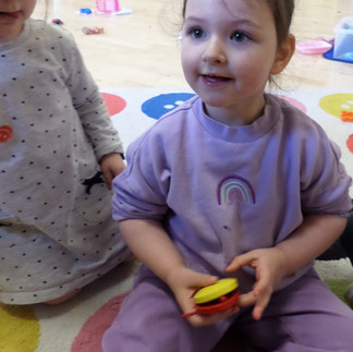 We enjoyed lots of music this week too. Tracey led sessions with the keyboard, introducing the children to pitch and tone, notes and scales. All of the children enjoyed taking turns and exploring the instrument. We've been enjoying dancing to the Frog Chorus and this week we extended the experience by watching an orchestra perform the song, the children curious about the instruments they could see. Then enjoying making their own sounds with a variety of percussion instruments, a couple even sounded like a frog. Wendy's frog spawn visited us again too and the children all realised that it had changed, "no spots" "I can see tails" the tadpole outline was becoming more visible and little tails could be seen on the comma shaped spawn. We are all excited to watch its progress over the coming weeks. The children are continuing to show great enthusiasm for frogs and fascination in the their lifecycle. Prompting wonder if they could come in one morning and find lots of jumping frogs in the hall and where are mummy and daddy frog? it's started them wondering about other creatures too, a ladybird flew in and settled on the toys "look, can I hold it?" and "argh it's a spider!" magnifying glasses have been out and the children have been very keen to be out and about in the garden, digging and peeking under logs.